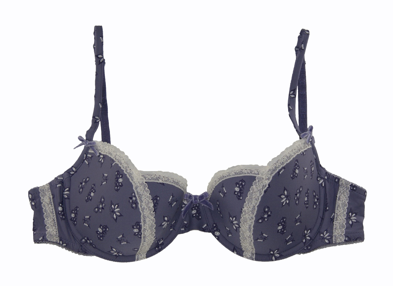 Beautiful balconette bra in luxurious moonlight-blue color with exquisite little butterflies print. A special addition in our lingerie collection. The lining of the cup 100%cotton, which helps to release and absorb odor from your delicate skin. Partially adjustable narrow straps, decorated with logo at the back (one of our top suppliers).